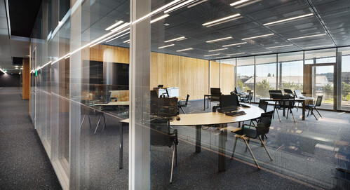 Das Herzstück des Schulungscenters bildet die 1.200 m² große Maschinenhalle im Erdgeschoss. Dort stehen 15 voll funktionsfähige ALLROUNDER Spritzgießmaschinen aller Baugrößen und Antriebsarten bereit – ausgestattet mit Robot-Systemen, IoT-Gateways sowie einer Anbindung an das Arburg Leitrechnersystem. Ergänzt wird das Angebot durch einen ARBURG Freeformer für Schulungen in der additiven Fertigung. Die Maschinenhalle ist durch eine Innenverglasung vom restlichen Erdgeschoss getrennt und verfügt über eine Hängekrananlage, die im Tandembetrieb bis zu 40 t bewegt. Eine Spannbetonkonstruktion ermöglicht die stützenfreie Weite der Halle.