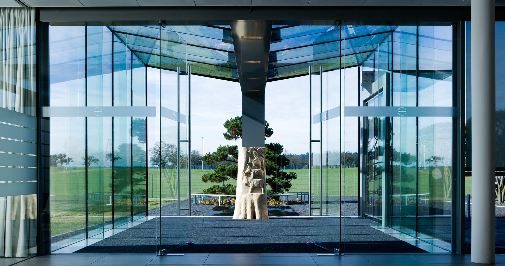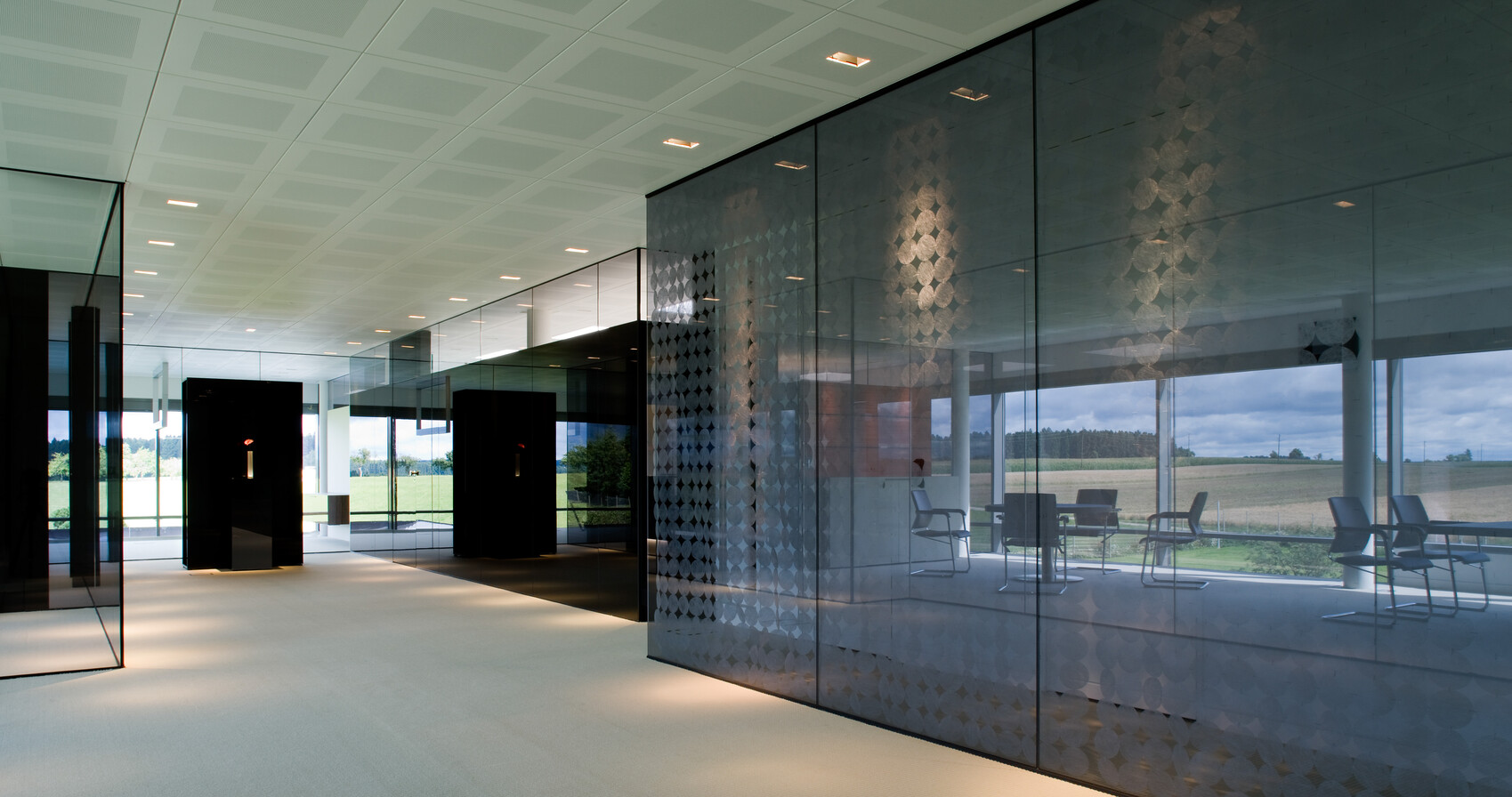 Der Eingangsbereich vermittelt die Offenheit gegenüber neuen Ideen und kundenspezifischen Anforderungen. Herzstück ist ein Glaskubus, der nahezu vollständig aus Glas gefertigt wurde – einschließlich der tragenden Elemente.