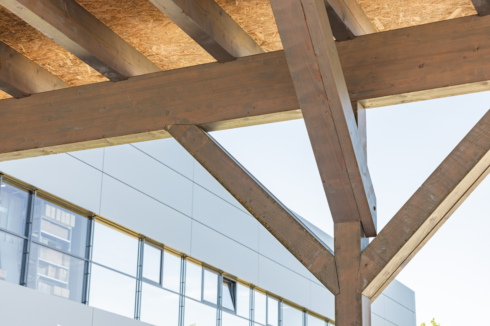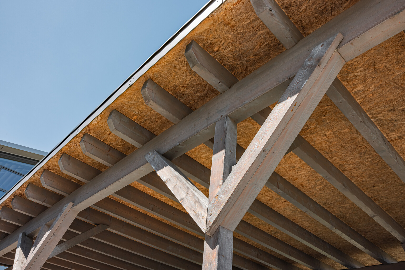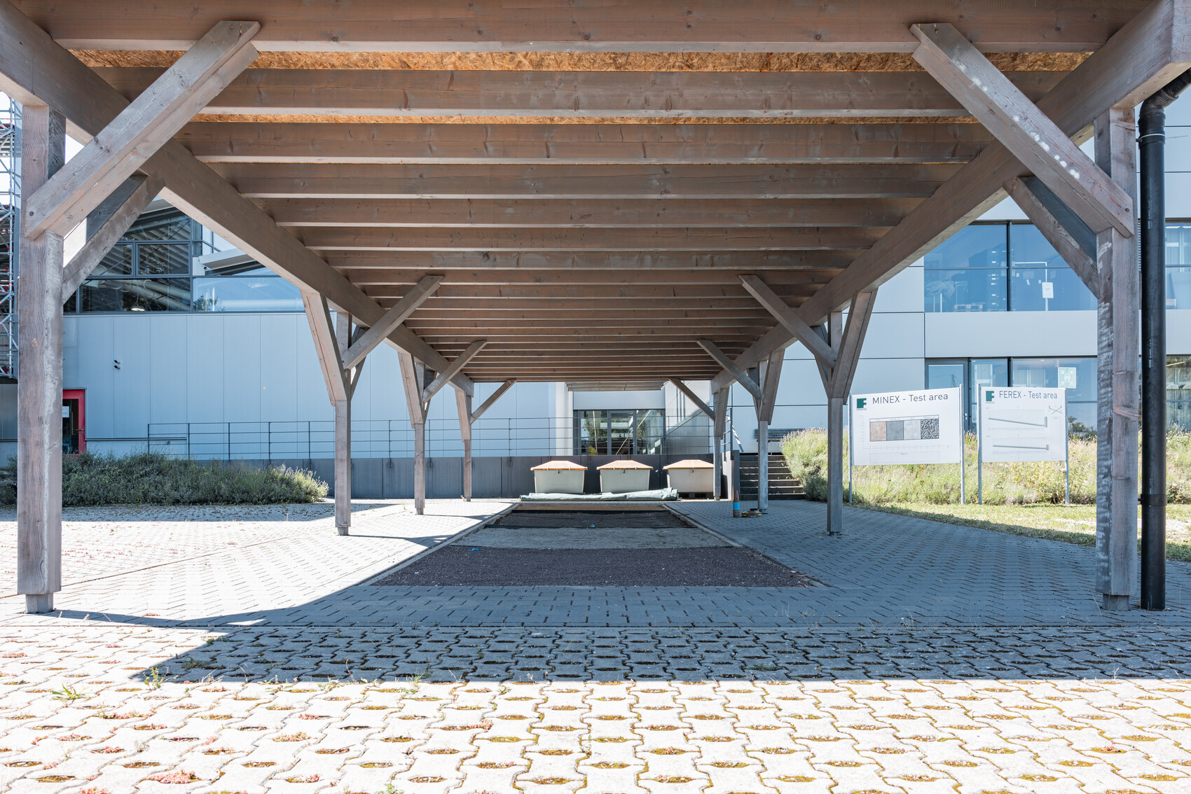 Die Lösung war ein Bauwerk nach archaischen Prinzipien: eine komplett metallfreie Konstruktion, bei der ein Großteil der Komponenten aus Holz besteht, von der Überdachung über alle tragenden Elemente und Verbindungen bis zu den Dübeln. Elemente wie Dachabdeckungen, Regenrinne und Rohr sowie Fallleitung hingegen sind aus Kunststoff.