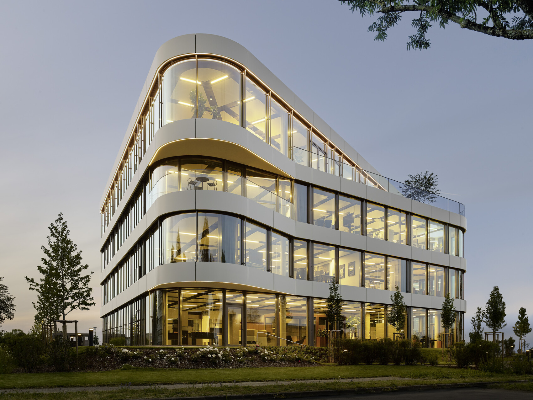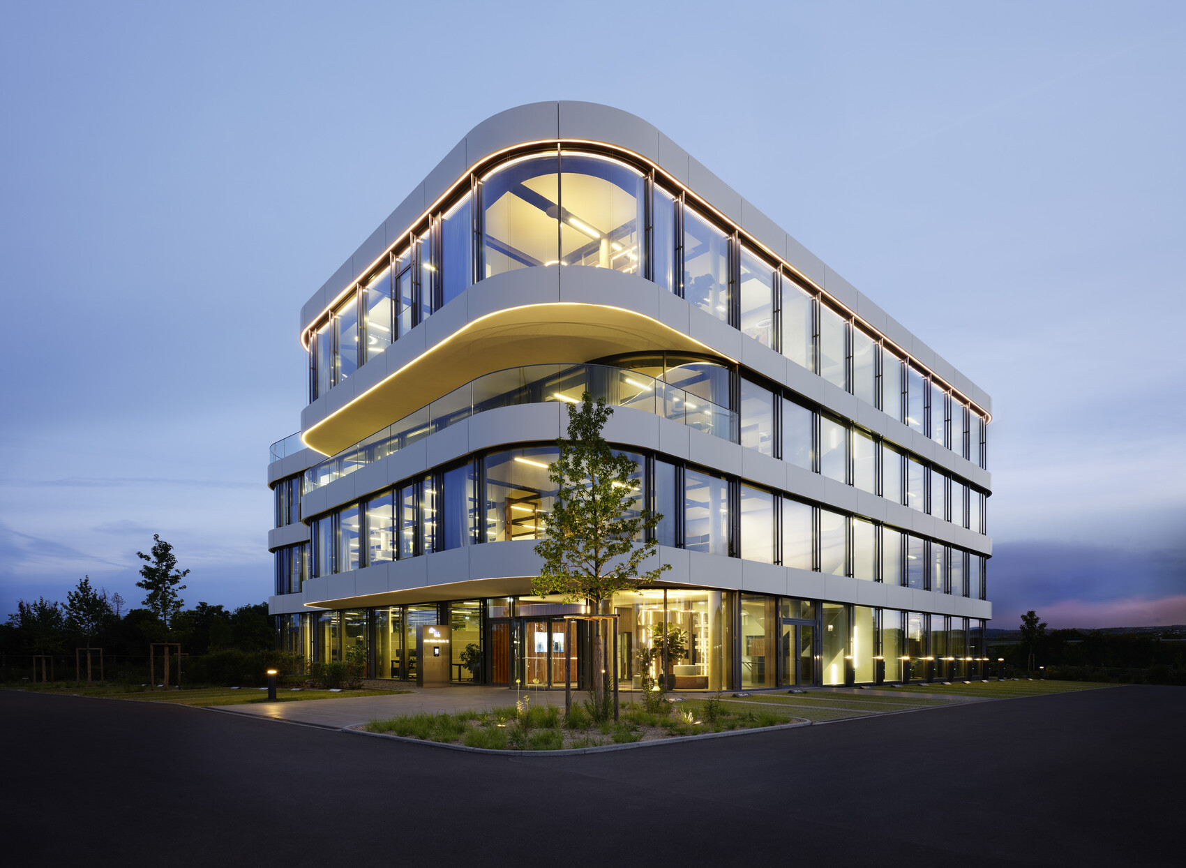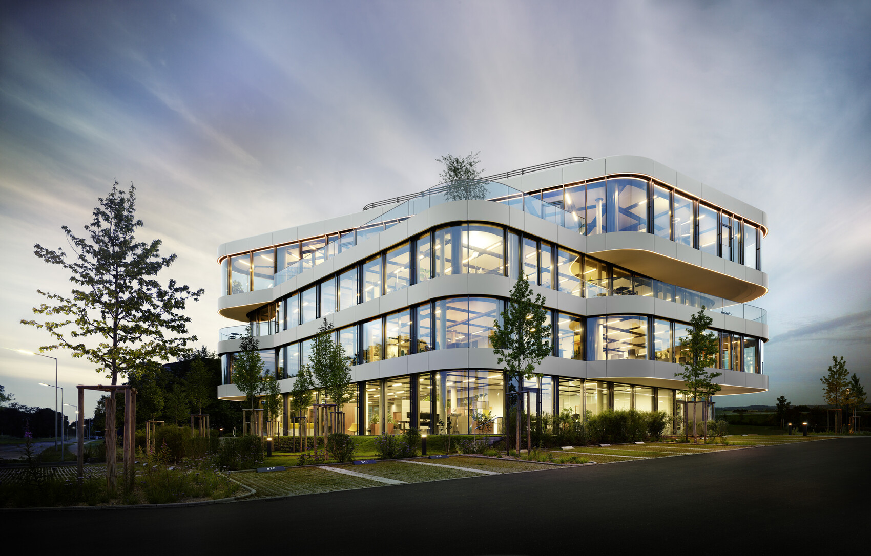 Das Gebäude ist durch Nahwärme versorgt, in KfW-Standard 55 gebaut und mit Photovoltaik-Anlagen auf dem Dach ausgestattet, die 10 E-Ladesäulen versorgen. Die Dachfläche ist zudem begrünt. Temperierbare Deckensegel sorgen für ein behagliches Heizen und Kühlen. Die Terrassen für die Mitarbeiter sind wohltuende Rückzugsorte.