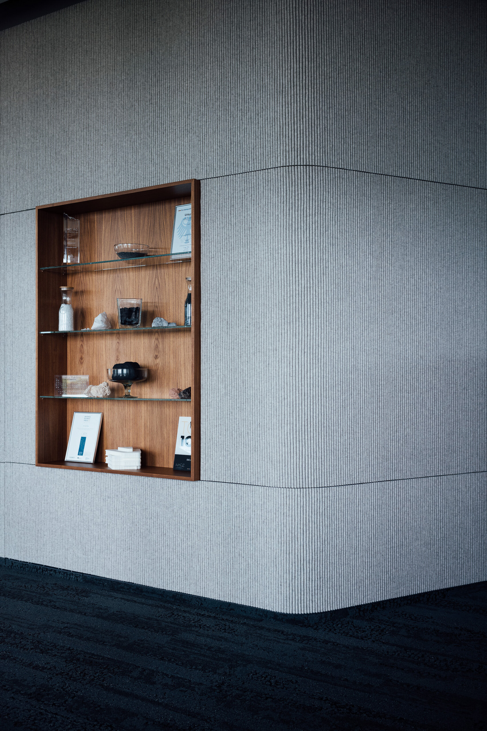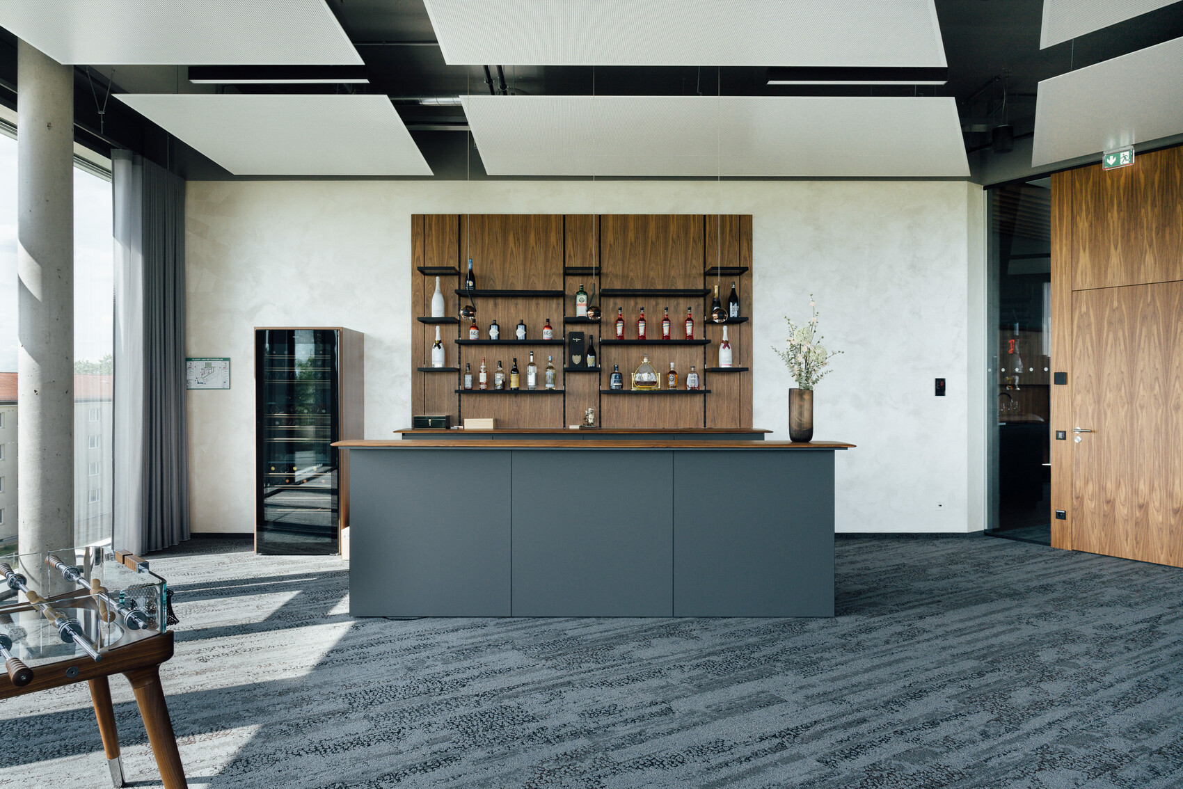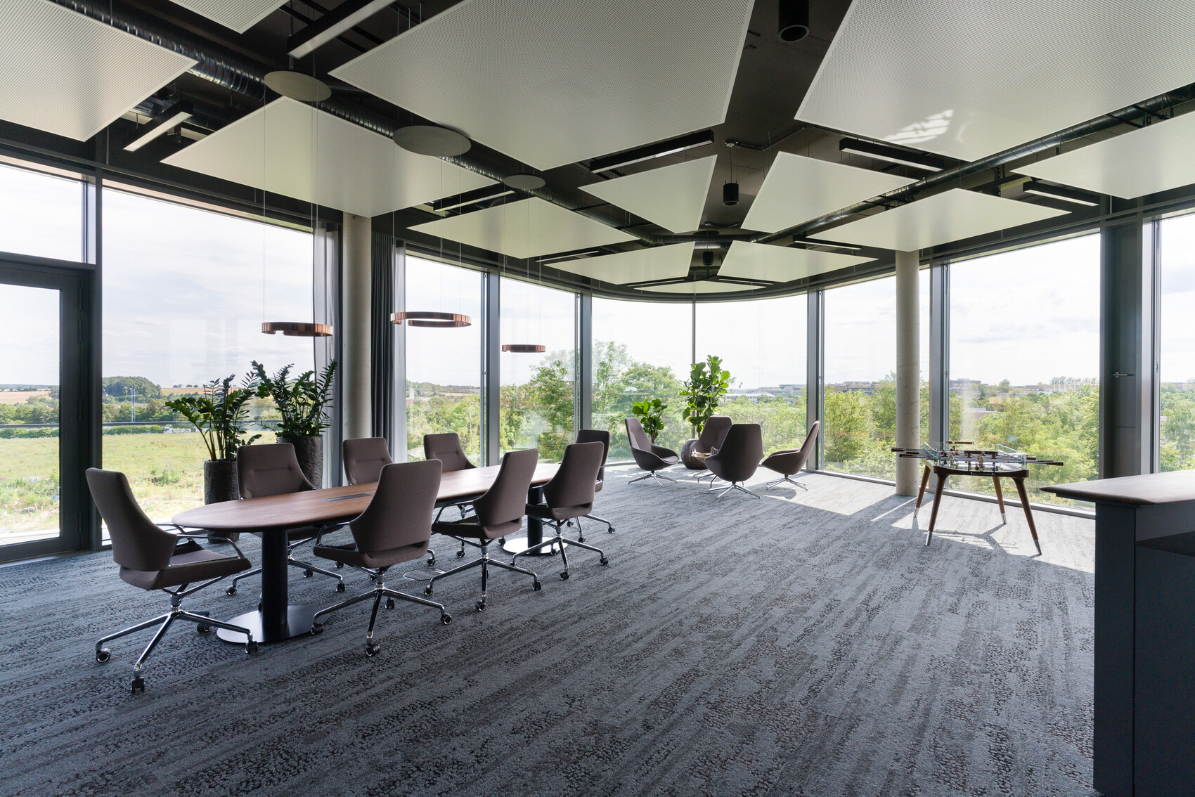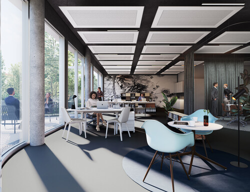 Das Gebäude ist durch Nahwärme versorgt, in KfW-Standard 55 gebaut und mit Photovoltaik-Anlagen auf dem Dach ausgestattet, die 10 E-Ladesäulen versorgen. Die Dachfläche ist zudem begrünt. Temperierbare Deckensegel sorgen für ein behagliches Heizen und Kühlen. Die Terrassen für die Mitarbeiter sind wohltuende Rückzugsorte.