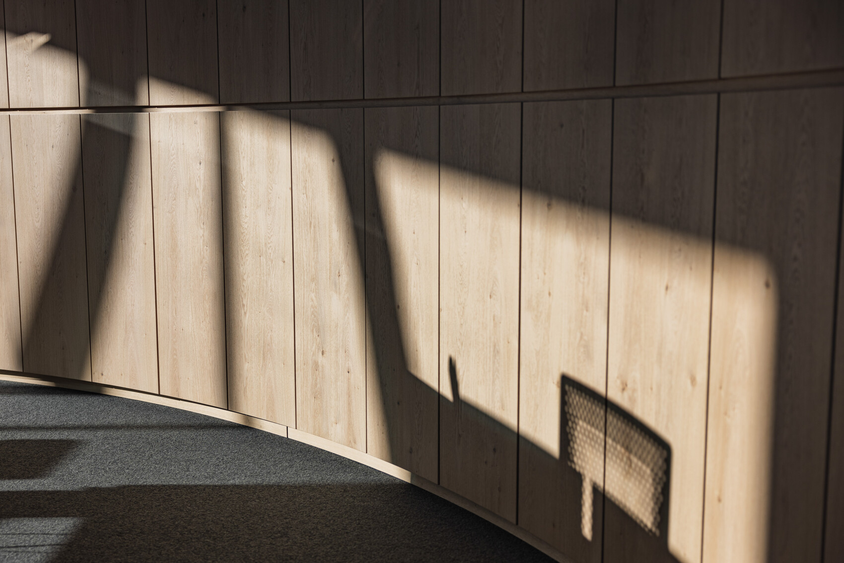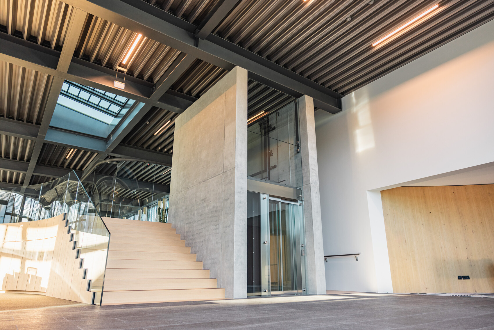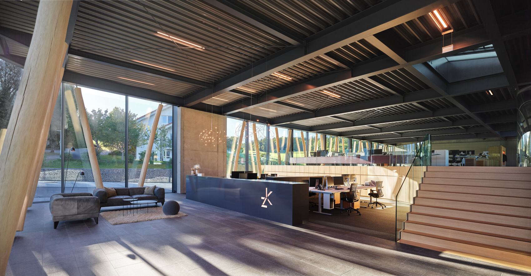 Architektonisch setzt das Ensemble auf eine enge Verbindung der Gebäude. Vier Übergänge auf unterschiedlichen Ebenen schaffen eine spannungsvolle, dreidimensionale Erschließung. Der Showroom wurde großzügig geöffnet und in den Besucherweg integriert. Eine einheitliche Fassadengestaltung verbindet Verwaltung und Produktion zu einer klar erkennbaren architektonischen Identität. Im Verwaltungsbereich setzt eine Mischkonstruktion aus optimiertem Stahlbau und massivem Eichenholz einen warmen, natürlichen Akzent und verweist zugleich symbolisch auf den Werkstoff, der in der Tischlerei veredelt wird. Großformatige Glasflächen schaffen Transparenz im Verwaltungsbau und öffnen die Produktionshalle zur Außenwelt.